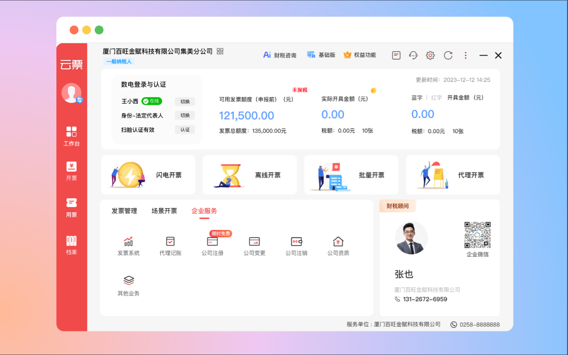 云票助手集多功能的一款智能产品,实现电子发票自动签章,发票开具及发票上传相应时间快,内部嵌入发票查验、网上发票勾选、税收风险监测及办税日历,真正实现“互联网+税务”便捷。   查看更多 >
